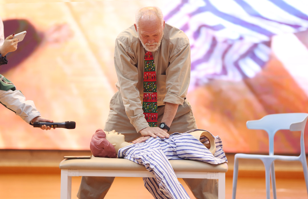 Tom校长非常风趣幽默。他不但详细介绍了如何正确拨打急救电话,以及对伤员进行初步检查和评估的基本知识,还深入剖析了海姆立克急救法和胸外按压的操作技巧。为了让同学们能够更加生动更加深入地了解和掌握急救知识,Tom校长以自己亲身经历过的几次急救事件为例,详细讲解了海姆立克急救法和胸外按压的技巧,并且通过现场演示和练习的方式,帮助同学们更好地掌握这两种急救方法。