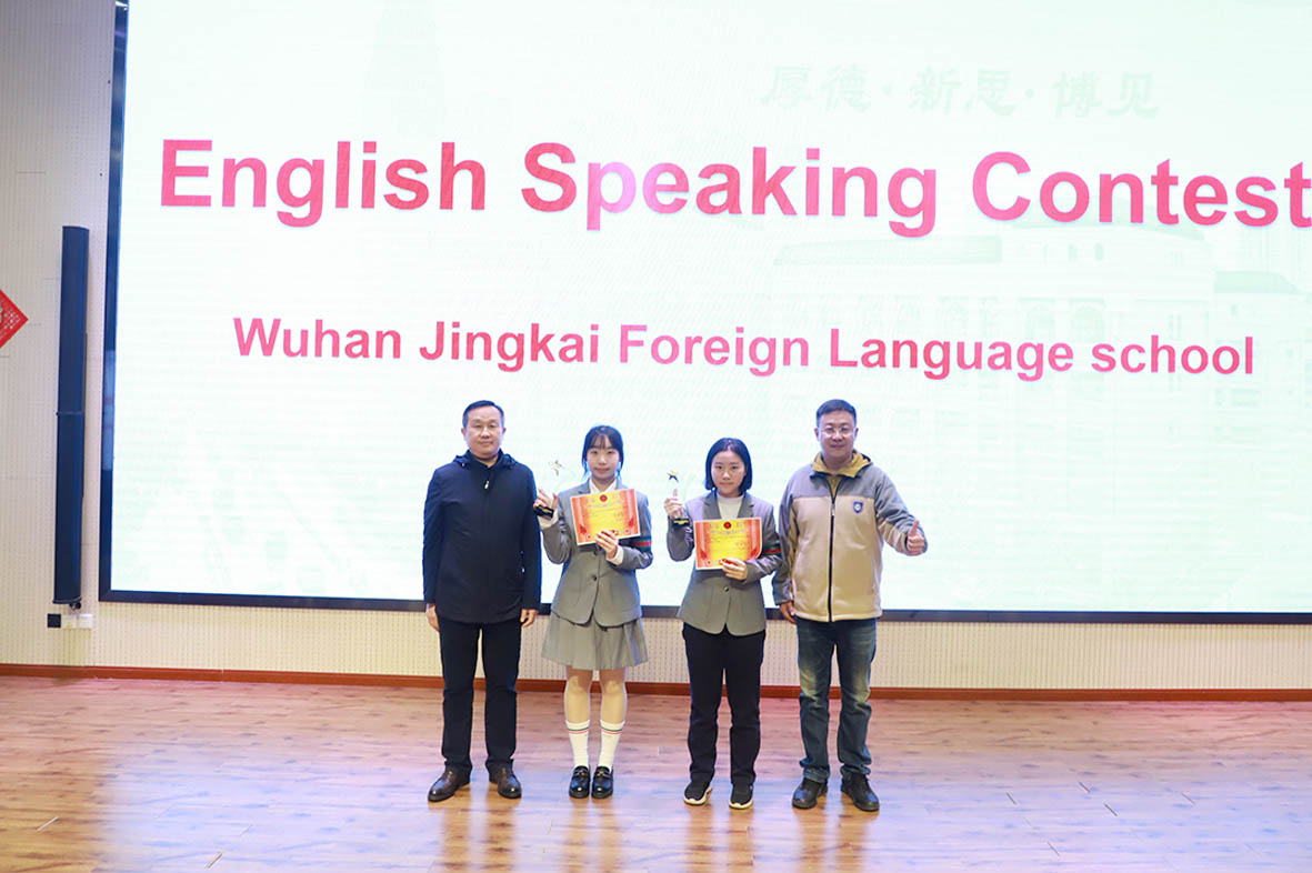 最后,经过学生代表评委团、教师评委团共同评议,评选出“风采之星英语演讲暨海报设计大赛”的一、二、三等奖,由经开外国语学校总督学袁汉杰、高中执行校长李轶、高一年级主任胡海东、高中教务副主任邓燕为获奖学生颁发奖杯和奖状。