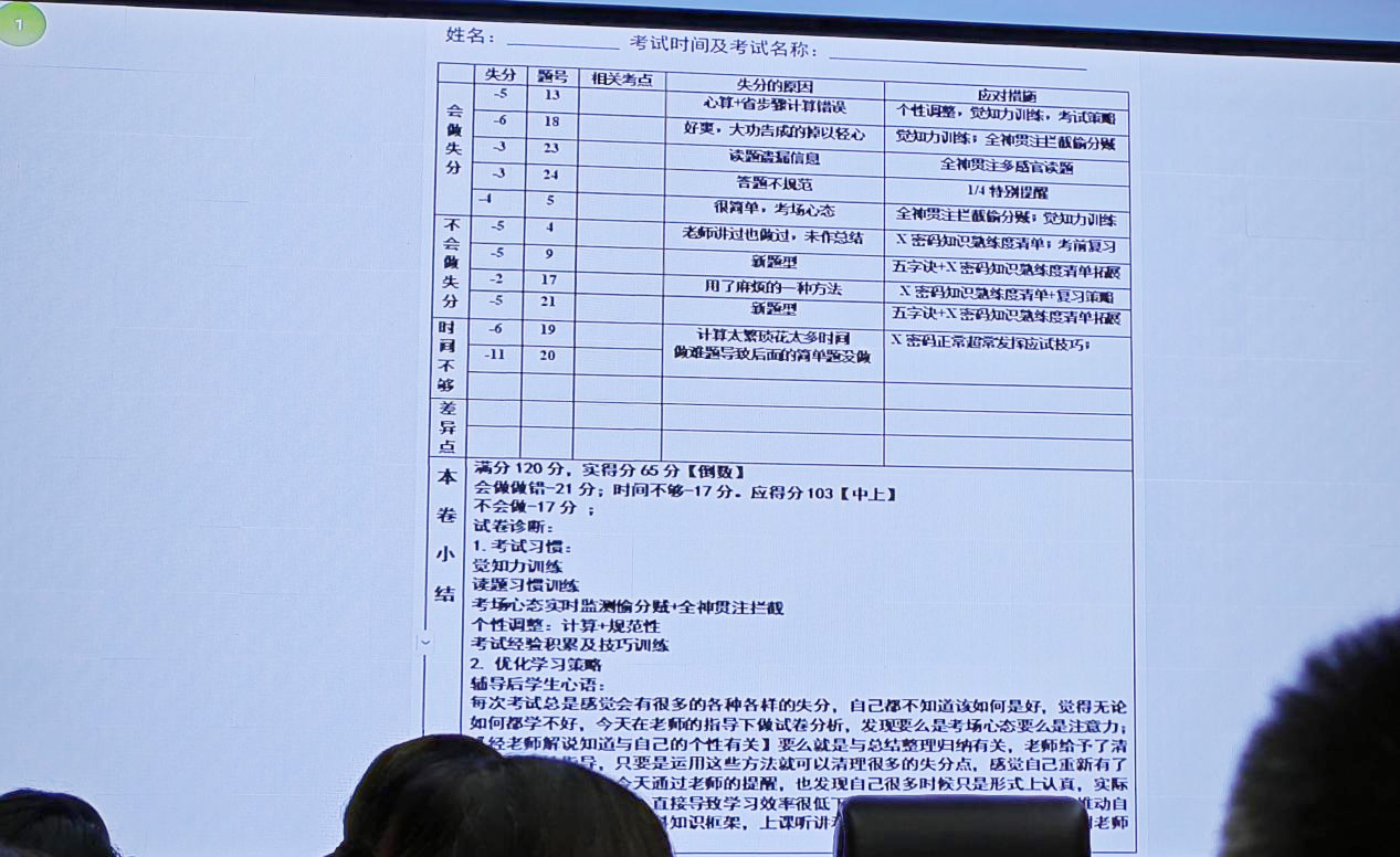 一位家长课后谈到:“对于孩子的一切,一定要基于事实数据说话,如果习惯性带入自己的主观假设、判断等,很容易让孩子打开防御系统。亲子关系如果出问题了,孩子就不愿意沟通了。在协同孩子学习时要说有可操作性的话,孩子不准我碰书包、进房间是因为怕我说她。孩子平时不愿意给我讲学习具体问题是因为她觉得我给不到有效的帮助,但是今天那个考试分析清单表非常好。”另一位家长分享了自己的感受:“对孩子学习这件事,我们自动的‘假大空’还是很多,我们要接受自己的知识盲区和认知边界,不要关于孩子的任何事情都认为自己比孩子更清楚,或‘赤脚医生’指手画脚。利用今日所学的试卷诊断科学指引孩子,和孩子一起慢慢改善她的学习困惑。”