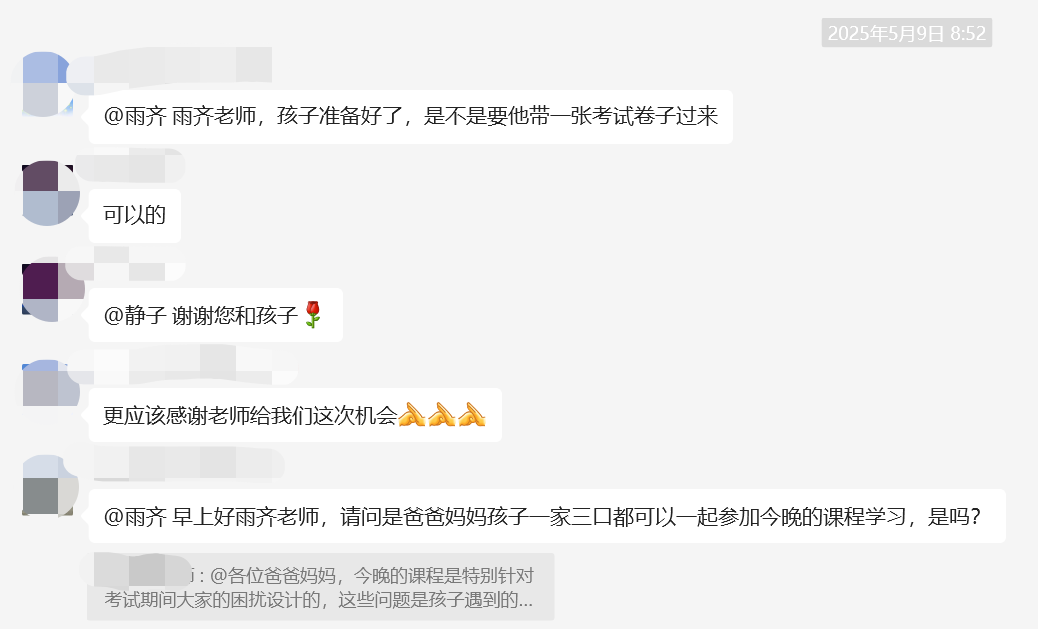 5月8日16时53分,陈欣老师在群里提醒父母沙龙照常进行;16时56分,雨齐老师提醒是期中考试复盘。次日8时21分,雨齐老师在群里发信息提醒,该课程适合爸爸妈妈和孩子一起听,并邀请孩子报名。陈欣老师也提醒家长报名并提前安排座位。群里瞬间 “躁动” 起来,家长们纷纷回复带孩子来。